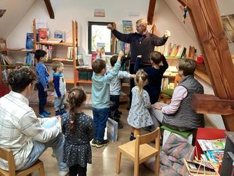 Den ganzen Besuch über stellten sie sich auch mit viel Geduld den vielen Fragen der Kinder und begleiteten beim Erkunden und Entdecken der Bücher.