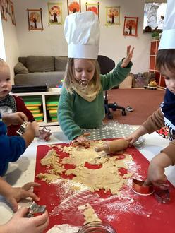 Begeistert, interessiert und mit großem Einsatz stechen die Kinder Plätzchen aus, die sie dann mit Zuckerperlen verzieren und am Ende naschen dürfen.
