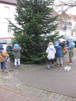 Nach einem kurzen Spaziergang zum Marktplatz trafen die Kinder ganz gespannt mit ihren Erzieherinnen ein. Mit Hilfe der Erzieher konnten die Kinder ihre kunstvollen Holzornamente an den Zweigen des großen Weihnachtsbaums anbringen. Der Baum erstrahlt nun in neuem Glanz und die Kinder waren stolz auf ihr gemeinsames Werk, das nun den gesamten Ort verschönert.