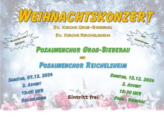 Sowohl am 7.12. um 19 Uhr in der Evang. Kirche Reichelsheim als auch am 15.12 um 18:30 Uhr in der Michaelskirche geben wir mit Gastsänger, Klavier und Gesang ein Weihnachtkonzert.