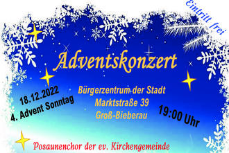 | 19.00 Uhr | Der Posaunenchor lädt ein zum Adventskonzert im Bürgerzentrum, Großer Saal, Marktstr.3, Eintritt frei. |