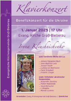 Die ukrainische Pianistin Iryna Kliushnichenko spielt zugunsten der Ukraine Stücke von Bach, Lully, Haydn, van Beethoven, Schubert und Chopin am Flügel in der Evang. Michaelskirche. Sie sind herzlich eingeladen. Der Eintritt ist frei.