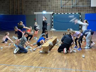 Dann wurde es dunkel und die „Polarlichter“ (Knicklichter) leuchteten in der Halle. Nachdem die vier Teams ihre jeweilige Farbe bei einem Wettrennen eingesammelt hatten, wurde in einer großen Gemeinschaftsaktion der Schriftzug LEICHTI auf dem Boden ausgelegt (zu sehen auf der Website des SV 45 Groß-Bieberau).