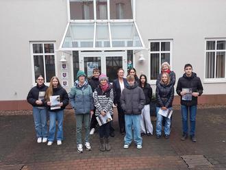 Letzten Dienstag hatte eine 7. Realschulklasse der Albert-Einstein-Schule unter der Leitung von Frau Dr. Steinheisser die Gelegenheit, das Rathaus zu besuchen und mit Frau Bürgermeisterin Vogt ins Gespräch zu kommen. Die Schülerinnen und Schüler wurden herzlich empfangen und erhielten bei einem Rundgang durch das Rathaus einen Einblick in die kommunalen Abläufe und die Aufgaben der Stadtverwaltung.