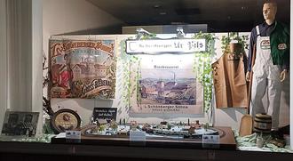 Die Schaufenster zeigen Bilder, Gläser und Krüge sowie Werbeartikel der Brauerei Schönberger. Wir danken den Sammlern Matthias Hörr und Wolfgang Pabst für die Bereitstellung der Exponate.