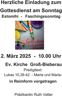 | 10.00 Uhr | Gottesdienst an Faschingssonntag (Ruth Vetter) |