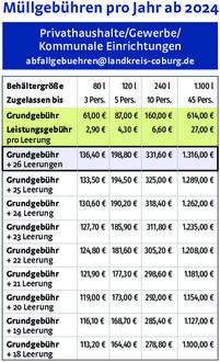 Angesichts dieser erheblichen Kostensteigerung ist der Landkreis Coburg gezwungen, die Müllgebühren ab dem 1. Januar um etwa 24 Prozent anzuheben: Bei einer 80-Liter-Mülltonne (drei Personen) und der Höchstzahl von 26 Leerungen bedeutet dies einen Anstieg von 112,60 auf 136,40 Euro; eine 120-Liter-Tonne (fünf Personen) wird künftig bei 26 Leerungen mit 198,80 statt bisher 156,60 Euro abgerechnet. Beim Landkreis Coburg liegen die Müllgebühren im Landkreis Coburg nach dieser Entscheidung in etwa auf dem Niveau wie zu Beginn der 90er Jahre.