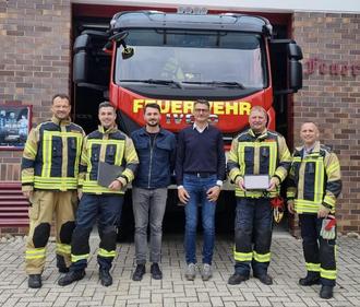 Über die neu beschaffte Ausrüstung freuen sich v.l. Marcus Henkel (1. Vorsitzender), Yannick Scheler (2. Vorsitzender), Robert und Roland Kern (Geschäftsführer der Ernst Kern GmbH), Oliver Lulei (Stellvertretender Kommandant) und Jens Zetzmann (Kommandant)