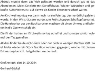 Gerhard Göckel aus Großheirath hat den Ablauf der Kirchweih aus den 1950er bis 1960er Jahren festgehalten. Wir möchten den Bürgerinnen und Bürgern diese schöne Tradition in Erinnerung rufen und veröffentlichen mit Zustimmung des Autors diesen Artikel.
