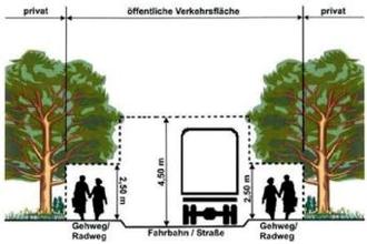 Über den öffentlichen Geh- und Radwegen muss eine Durchgangs- und Durchfahrtshöhe von 2,50 Meter gegeben sein. Über der Fahrbahn einer öffentlichen Straße beträgt dieses Maß 4,5 Meter.