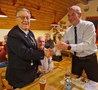 Nachdem der Ehrenvorsitzende Friedrich Stang dreimal den besten Tiefschuss auf die Scheibe brachte, wurde ihm durch den Schießwart der Wanderpokal endgültig zum Verbleib überreicht.