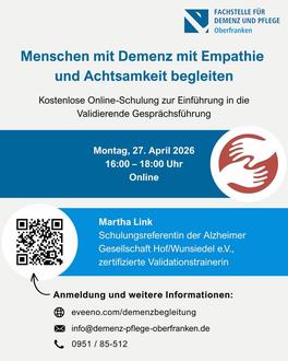 Die Fachstelle für Demenz und Pflege Oberfranken lädt am Montag, den 27. April 2026 zu einem kostenlosen Online-Vortrag über die validierende Gesprächsführung im Umgang mit Menschen mit Demenz ein. Von 16:00 bis 18:00 Uhr gibt Martha Link, Schulungsreferentin der Alzheimer Gesellschaft Hof/Wunsiedel e.V. und zertifizierte Validationstrainerin, Einblicke in die Kommunikationsmethode. Der Vortrag richtet sich an An- und Zugehörige von Menschen mit Demenz, beruflich und ehrenamtliche Tätige und alle Interessierten, die ihre Kommunikation mit Menschen mit Demenz verbessern möchten.