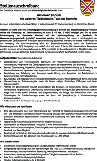 | • | Mithilfe im gemeindlichen Bauhof einschließlich des Einsatzes im Winterdienst. Hierzu gehören insbesondere Tätigkeiten zur Unterhaltung, Instandsetzung und Reinigung der gemeindlichen Straßen, Wege und Plätze sowie Gebäude und Liegenschaften, die Pflege der öffentlichen Park- und Grünanlagen, der Friedhofsanlagen sowie der Sport- und Spielplätze (z. B. Wassertretanlage, Kinderspielplätze) |