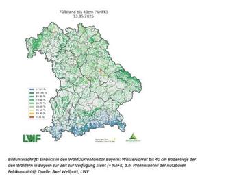 Ab sofort stellt die Bayerische Landesanstalt für Wald und Forstwirtschaft (LWF) aktuelle Informationen zur Bodenfeuchte in Bayerns Wälder für jedermann digital zur Verfügung.