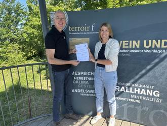 Foto (Petra Schraut): Heidi Roth, Servicebüro Ehrenamtskarte vom Landratsamt, freut sich über den neuen Partner der Ehrenamtskarte und überreicht als Dank eine von Landrätin Sabine Sitter unterzeichnete Urkunde an Josef Schraut, Gästeführer Weinerlebnis Franken.