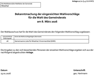 Die Wahlleiterin/Der Wahlleiter der Gemeinde Wiesthal: Bekanntmachung der eingereichten Wahlvorschläge für die Wahl des Gemeinderats am 8. März 2026
