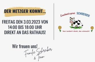 nachdem wir keinen Metzger mehr vor Ort haben, möchte die Landmetzgerei Schreiber (bekannt vom Wochenmarkt in Lohr) mit ihrem Verkaufswagen nach Partenstein kommen. Erster Termin ist Freitag, der 03.03.2023. Der Verkaufswagen wird an diesem Tag zwischen 14:00 Uhr und 18:00 Uhr am Rathaus stehen. Nutzen Sie die Gelegenheit um regionale Fleisch- und Wurstprodukte direkt vom Erzeuger zu kaufen. Bei entsprechender Resonanz könnte es zur dauerhaften Einrichtung werden.