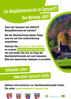 Um ein noch besseres Bild vom bayerischen Spessart zu erhalten und herauszufinden, wie die Menschen ihre Region wahrnehmen und was ihnen für die Zukunft wichtig ist, bitten die Landkreise Aschaffenburg, Main-Spessart und Miltenberg sowie die Stadt Aschaffenburg ihre Bürgerinnen und Bürger darum, im Zuge der Machbarkeitsstudie „Biosphärenreservat Spessart“ an einer Online-Befragung teilzunehmen. Die Umfrage dauer 10 bis 15 Minuten und ist bis zum 11. April 2023 unter https://www.main-spessart.de/br freigeschaltet.