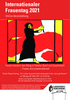 Die Frauenverbände und -organisationen und die Gleichstellungs- beauftragte des Landratsamtes Forchheim, haben sich aufgrund der aktuellen Lage dazu entschlossen, anlässlich des internationalen Frauentages am Montag, 08. März 2021 um 19.30 Uhr erstmals eine Online-Veranstaltung anzubieten. Die Teilnahme ist kostenfrei und bequem von zu Hause aus möglich. Der Zugangslink wird am Tag der Veranstaltung auf der Homepage des Landkreises Forchheim www.lra- fo.de zu finden sein.