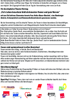 Equal-Pay? Wichtiges Thema, denn nach wie vor werden Frauen schlechter bezahlt, doch Homeoffice und Kurzarbeit lähmen alle Bemühungen. Infos zum Theater-Vortrag am 08. März - Für’s Leben brauchste bloß säckeweise Humor und gute Nerven „Was hatten wir früher für einen Stress! Heute nehmen wir’s mit Humor!“ Zum Glück gibt es Gerdie Preuß, unverwüstliche Kioskbetreiberin, die zu allem ihren Senf gibt und mit viel Humor die Tücken zwischen Homeoffice, Not-Kita, Supermarkt und Social Media aufs Korn nimmt. Also einmal Lebensfreude volltanken, bitte. Dazu Zuversicht und eine große Portion Humor mit Sahne.