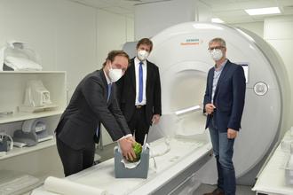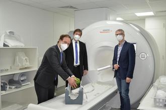 Der Aufsichtsratsvorsitzende der Klinikum Forchheim-Fränkische Schweiz gGmbH, Oberbürgermeister Dr. Uwe Kirschstein, und Landrat Dr. Hermann Ulm ließen sich vom Chefarzt der Radiologie, Dr. med. Hannes Seuß, die Eigenschaften dieses Neuzuganges erläutern. Die Funktionsweise demonstriert der Radiologe an einer Wassermelone. Hannes Seuß sagt: „Es ist keine Revolution der Bildgebung, sondern eine Evolution, der nächste große Schritt. Das Magnetfeld ist homogener, die Gradienten stärker und die Sequenzen vielfältiger. Dadurch entstehen aussagekräftigere Bilder und bessere Diagnosen.“
