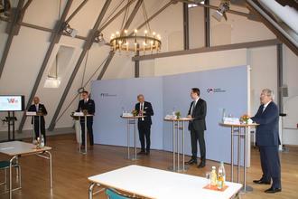 (v.l.) Alexander Brehm, Vorstand VR Bank Bamberg Forchheim eG, Joachim Hausner, stellvertretender Vorstandsvorsitzender VR Bank Bamberg Forchheim eG, Gregor Scheller, Vorstandsvorsitzender VR Bank Bamberg Forchheim eG, Stefan Benecke, Vorstand Vereinigte Raiffeisenbanken, Rainer Lang, Vorstand Vereinigte Raiffeisenbanken.