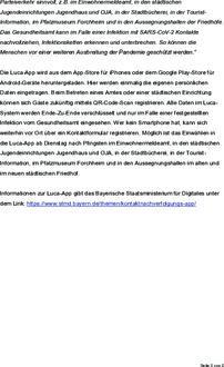 Oberbürgermeister Dr. Uwe Kirschstein begrüßt diese digitale Lösung ausdrücklich: „Der Einsatz der Luca-App erscheint in städtischen Einrichtungen mit viel Parteiverkehr sinnvoll, z.B. im Einwohnermeldeamt, in den städtischen Jugendeinrichtungen Jugendhaus und OJA, in der Stadtbücherei, in der Tourist-Information, im Pfalzmuseum Forchheim und in den Aussegnungshallen der Friedhöfe. Das Gesundheitsamt kann im Falle einer Infektion mit SARS-CoV-2 Kontakte nachvollziehen, Infektionsketten erkennen und unterbrechen. So können die Menschen vor einer weiteren Ausbreitung der Pandemie geschützt werden.“ Die Luca-App wird aus dem App-Store für iPhones oder dem Google Play-Store für Android-Geräte heruntergeladen. Hier werden einmalig die eigenen persönlichen Daten eingetragen. Beim Betreten eines Amtes oder einer städtischen Einrichtung können sich Gäste zukünftig mittels QR-Code-Scan registrieren. Alle Daten im Luca-System werden Ende-Zu-Ende verschlüsselt und nur im Falle einer festgestellten Infektion vom Gesundheitsamt eingesehen. Wer kein Smartphone hat, kann sich weiterhin vor Ort über ein Kontaktformular registrieren. Möglich ist das Einwählen in die Luca-App ab Dienstag nach Pfingsten im Einwohnermeldeamt, in den städtischen Jugendeinrichtungen Jugendhaus und OJA, in der Stadtbücherei, in der Tourist-Information, im Pfalzmuseum Forchheim und in den Aussegnungshallen im alten und im neuen städtischen Friedhof.