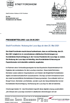 Stadt Forchheim. Die Stadt Forchheim macht darauf aufmerksam, dass es ab Dienstag, den 25. Mai 2021 möglich ist, in verschiedenen städtischen Einrichtungen zur Kontaktdaten-Nachverfolgung in der Corona-Pandemie die Luca-App zu nutzen. Die Nutzung der Luca-App ist freiwillig, eine Kontaktdaten-Erfassung per Papierformular wird ebenfalls weiterhin angeboten. Im Rahmen einer Verhandlungsvergabe hat das Bayerische Staatsministerium für Digitales die Landeslizenz für die Luca-App erworben. Diese bietet Behörden, Betrieben sowie weiteren Organisationen und Gästen die Möglichkeit Kontaktdaten digital und datenschutzkonform auszutauschen. Die App auf dem Smartphone kann die meist handschriftliche Kontaktdaten-Erfassung ersetzen. Das entlastet nicht nur Bürger*innen, Behörden und Betriebe, sondern auch die Gesundheitsämter bei der Kontaktdaten-Nachverfolgung. Die Nutzung der Luca-App für alle ist kostenlos.