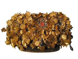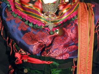 Stadt Forchheim - Beispiele für die herausragende textile Handwerkskunst aus dem Trachtenmuseum im Pfalzmuseum Forchheim: Detail der Historischen Festtagstracht, rotes Hörnertuch, Brautkrone.