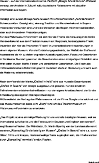 Unter dem Titel „Crafted in Bavaria“ eröffnet sich für die handwerklich orientierten Museen ein reichweitenstarkes Kommunikations- und Werbefenster auch für kleinere Häuser - auf der internationalen Internet-Plattform „Google Arts & Culture“. Weltweit versorgt der Anbieter in Zukunft kulturtouristische Reiseströme mit aktueller Information aus Bayern. Beteiligt sind zurzeit 36 bayerische Museen mit unterschiedlichen „handwerklichen“ Schwerpunkten. Gezeigt wird, wie eng Tradition und Handwerkskunst in Bayern miteinander verbunden sind und viele Menschen die Region mit ihren traditionellen, aber auch innovativen Produkten prägen.