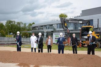 Gleich vier Spaten warteten in einem sorgfältig auf dem Klinikgelände vor dem Gebäude aufgehäuften Erdhaufen auf den Festakt. Dieser wurde coronabedingt mit deutlich weniger Gästen durchgeführt als geplant war.