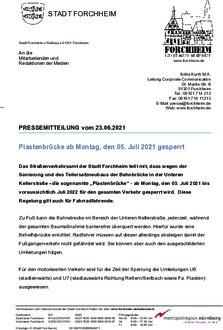Stadt Forchheim. Das Straßenverkehrsamt der Stadt Forchheim teilt mit, dass wegen der Sanierung und des Teilersatzneubaus der Bahnbrücke in der Unteren Kellerstraße - die sogenannte „Piastenbrücke“ - ab Montag, den 05. Juli 2021 bis voraussichtlich Juli 2022 für den gesamten Verkehr gesperrt wird. Diese Regelung gilt auch für Fahrradfahrende.