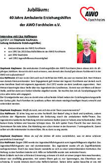 Stephanie Kaufmann: Was möchtest du noch zum Schluss zum Jubiläum erwähnen? Lisa Hoffmann: Wir möchten natürlich eine große Feier machen und ich möchte mich bei allen Mitarbeitern*innen bedanken für die gute, lange Zeit. Greta Schidan zum Beispiel hat ihr 25-jähiges Jubiläum schon lange hinter sich und gehört zu einer unserer langjährigsten Mitarbeiterinnen. Alle Mitarbeiter*innen haben viel Energie eingebracht und sich stetig weitergebildet. Sie sind der AWO zu großen Teilen treu geblieben. Daher möchte ich Ihnen ein großes Dankeschön sagen. Bedanken möchte ich mich auch bei dir, dass du seit vielen Jahren das Team so gut führst. Ebenso beim Jugendamt und seinen Leitern, Herrn Leisgang, Herr Haendl und Frau May.