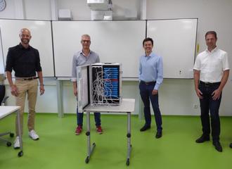 Stadt Forchheim - In der Adalbert-Stifter-Grund- und Mittelschule Forchheim präsentieren Oberbürgermeister Dr. Uwe Kirschstein, Viktor Naumann, Wirtschaftsförderer der Stadt Forchheim ,Mathias Reznik, kaufmännischer Geschäftsführer der Stadtwerke Forchheim und Christian Palla, Leiter der Telekommunikation der Stadtwerke Forchheim symbolisch die Ladestation mit Tablets.