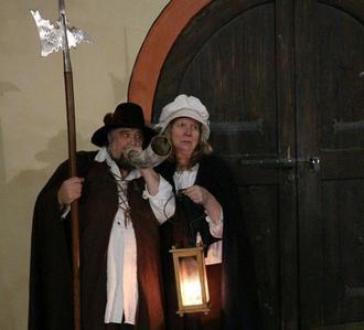 (Führungsgebühr: Erwachsene 8,00 Euro, Kinder bis 12 Jahre 4,00 Euro)! Vinzent (Ludwig Daffner) und Kuni (Jutta Daffner) bewachen des nächtens die Stadt, damit die wackere Forchheimer Stadtbevölkerung auch sicher in ihren Betten schlafen kann. Doch Vinzent ist dem Biere allzu gut zugetan! Das führt bisweilen dazu, dass sein treues Eheweib Kuni seinen Dienst verrichten muss! Und so trifft man Vinzent oder Kuni oder auch beide zusammen des Nachts mit Hellebarde "Elfriede" und Laterne "Lucia" in den Gassen, wenn es heißt: „Kommt Ihr Leut und lasst Euch sagen, die Uhr will gleich Zwölfe schlagen...".