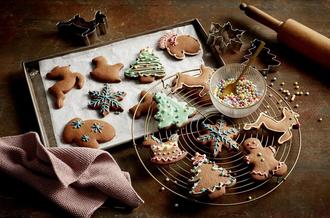 Teig auf einer bemehlten Arbeitsfläche ca. ½ cm dick ausrollen. Aus dem Teig mit weihnachtlichen Ausstechern (à ca. 7 cm lang; z. B. Rentiere, Weihnachtsbäume, Sterne, Handschuhe etc.) die Plätzchen ausstechen.