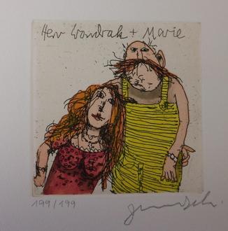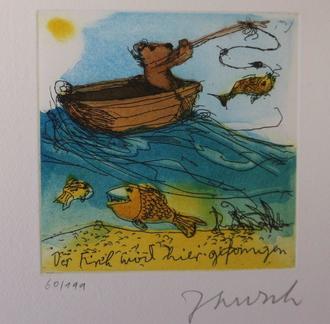 Dieser Druck wird anschließend vom Künstler mit Aquarellfarben koloriert. Das kolorierte Blatt geht zurück an den Drucker, der für jede verwendete Farbe eine eigene Druckplatte in Aquatinta herstellt. Diese Technik ermöglicht das Drucken von Flächen. Alle Druckplatten werden nun übereinander gedruckt. Aufgabe des Druckers ist es dabei, ein Druckergebnis zu erzielen, das exakt der kolorierten Vorlage entspricht. Ein Probedruck wird zurück an Janosch geschickt. Nach der Freigabe kann die Auflage schließlich gedruckt und anschließend signiert werden.