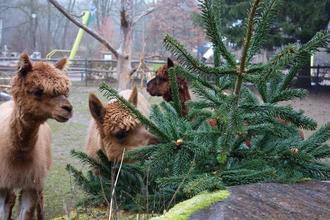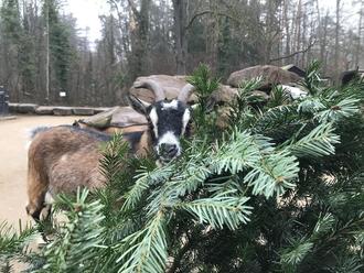 Zebus, Ziegen, Schafe und Alpakas haben bereits an den frisch geschlagenen Bäumen geknabbert. In den kommenden Tagen verteilt das Tiergartenteam die übrigen Weihnachtsbäume an weitere Pflanzenfresser wie Takine, Wisente, Bisons, Hirsche und viele mehr. Für sie ist das frische Grün eine willkommene Abwechslung auf dem Futterplan, aber auch noch mehr als das: „Wegen ihres Gehaltes an Rohfasern, Terpenen und ätherischen Ölen sind frische Nadelgehölze ein wertvolles Winterfutter“, sagt der Inspektor des Tiergartens, Thomas Seitz.