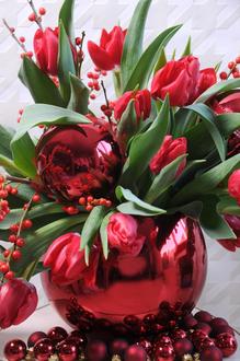 Gerade dann, wenn es draußen in der Natur eher trist und grau ist, begeistern Tulpen mit ihrem Farbenreichturm. Es gibt kaum eine Nuance, in der die Zwiebelgewächse nicht blühen. Im Advent sind vor allem die traditionellen Töne wie Schneeweiß, Dunkelviolett oder leuchtend Rot gefragt. Arbeitet man in einen solchen Strauß auch etwas Tannengrün oder Zweige der Stechpalme ein, bekommt er sofort einen weihnachtlichen Anstrich. Auch Schmuckelemente wie Sterne und Kugeln können integriert werden. Wer es zu den Festtagen etwas opulenter mag, wählt Amaryllis als Vasenpartner. Die imposanten Blüten der Weihnachtsklassiker thronen auf dicken, geraden Stielen und bilden einen schönen Kontrast zu den Tulpen, die sich in alle Richtungen winden und so dem Arrangement eine dynamische Note verleihen.