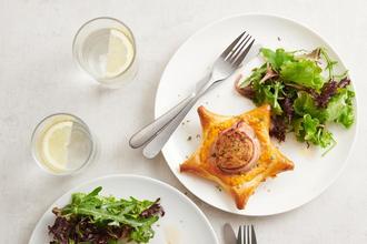Den Ofen auf 200 Grad Celsius vorheizen. Schweinefilets in Butterschmalz beidseitig je eine Minute anbraten, herausnehmen, würzen, auf einem Gitter auskühlen. Medaillons mit jeweils zwei Speckscheiben umwickeln. Frischkäse mit Ketchup und Cognac verrühren, würzen. Teig entrollen, mit dem Pastry Star von Betty Bossi vier Sterne ausstechen, in die Metallförmchen legen und eine Mulde formen. Je einen Esslöffel Paniermehl in die Mulden geben, Füllung mithilfe des Ausstechers auf die vier Sterne verteilen. Darauf die Medaillons legen und leicht andrücken. Teigränder mit etwas Ei bestreichen, auf ein Backblech legen. Etwa 18 Minuten auf der untersten Schiene des Ofens backen.