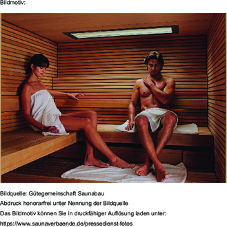 Und was in diesen stressreichen Zeiten besonders hervorzuheben ist: Die Sauna in den eigenen vier Wänden ist die ideale Möglichkeit, um nach einem anstrengenden Tag zu entspannen, abzuschalten und gleichzeitig etwas für die Gesundheit zu tun. Und die Sauna daheim hat immer geöffnet und kann genutzt werden, wann es Ihnen beliebt. Außerdem macht die Sauna noch mehr Spaß, wenn hochwertiges Holz verarbeitet wurde und die Qualitätskriterien erfüllt sind, die an eine Sauna mit dem RAL-Gütezeichen gestellt werden. Welche Kriterien beim Saunakauf zu beachten sind, finden Interessenten in einer Broschüre der Gütegemeinschaft Saunabau, Infrarot und Dampfbad e.V. Die Gütegemeinschaft verleiht das RAL-Gütezeichen für Saunen und Infrarotkabinen auf Basis von 30 Qualitätskriterien und bietet dem Verbraucher damit Orientierung beim Kauf. Weitere Informationen dazu finden Sie unter www.saunaverbaende.de.