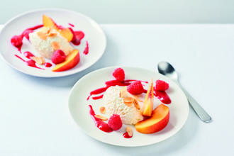 Joghurtmousse mit Mandeln, Sauce, Pfirsichspalten und frischen Himbeeren garniert anrichten.