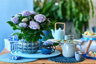 Schon ab April stehen die Magical Hydrangea in voller Blüte. Das Farbspektrum reicht von einem Pastellblau über Zartrosa bis hin zu einem dezenten Lavendelton. Mindestens 150 Tage lang erfreuen die blühenden Zimmerpflanzen und sind während dieser Zeit immer für eine Überraschung gut: Denn sie wechseln eindrucksvoll ihren Blütenton. Dafür brauchen die magischen Hortensien weder speziellen Dünger noch eine besondere Behandlung. Allein Tageslicht und Zeit braucht es, damit sich die Blütenblätter nach und nach verfärben. Die zuerst hellen Töne werden mit den Wochen immer intensiver, bis die Pflanzen schließlich in einer herbstlichen Färbung im Zimmer stehen. Der Magical Flowertree beispielsweise, eine Hortensie mit Hochstamm, trägt im Frühling ein intensives Blau zu Schau, zeigt im Sommer frische, grüne Nuancen und leuchtet im Herbst in einem satten Weinrot.