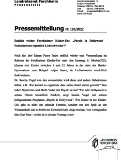 Landkreis Forchheim (lra-fo). Nach fast drei Jahren Pause findet endlich wieder eine Veranstaltung im Rahmen der Forchheimer Kinder-Uni statt: Am Samstag, 8. Oktober2022, können sich Kinder zwischen 9 und 12 Jahren in der Aula des Herder- Gymnasiums zum Beispiel zeigen lassen, ob Lichtschwerter tatsächlich funktionieren. Dr. Sascha Vogel von den sciencebirds wird diese und andere Geheimnisse lüften, z.B.: Wie kommt es eigentlich, dass James Bond immer gewinnt? Was haben Spiderman und Darth Vader mit Physik zu tun? Wie sehr Hollywood in seinen Filmen tatsächlich flunkert, zeigt Sascha Vogel mit seinem preisgekrönten Programm „Physik in Hollywood”. Wie immer in der Kinder- Uni geht es nicht um schnöde Formeln, sondern um den Spaß an der Wissenschaft, und es bleibt mit Sicherheit kein Auge trocken. Von Armageddon über Star Wars - nichts ist in diesem Vortrag sicher!