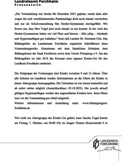 „Die Veranstaltung war bereits für Dezember 2021 geplant, wurde dann aber wegen der sich verschlimmernden Pandemielage doch noch einmal verschoben und nur als Schulveranstaltung fürs Herder-Gymnasium durchgeführt. Wir freuen uns, dass Herr Vogel jetzt noch einmal zu uns kommt. In der Aula des Herder-Gymnasiums haben wir viel Platz und können - falls nötig - Abstände und Hygieneauflagen gut einhalten,“ freut sich Landrat Dr. Hermann Ulm. Das Bildungsbüro im Landratsamt Forchheim organisiert federführend diese Veranstaltungsreihe. Gemeinsam mit dem Staatlichen Schulamt, dem Bildungsbeirat der Stadt Forchheim sowie dem Verein FOrsprung e.V. hat das Bildungsbüro im Jahr 2018 das Konzept einer eigenen Kinder-Uni für den Landkreis Forchheim erarbeitet.