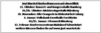 Am Sonntag, den 23. Oktober, ist es so weit! Die Just Married Hochzeitsmesse in Bamberg öffnet ihre Pforten. Die Messe findet in der Konzert- und Kongresshalle, in der Mußstraße 1 statt. Und gleich eine Woche später folgt am 29. und 30. Oktober in der Meistersingerhalle Nürnberg eine der größten Hochzeitsmessen in Franken.