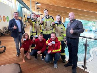 Königsbad Forchheim - Herbert Fuchs (Referatsleiter Bau-, Grün- und Bäderbetrieb) und Christian Lenkl (Betriebsleiter des Königsbads Forchheim) begrüßten Vertreter der Freiwilligen Feuerwehr Forchheim, der Forchheimer Ortsgruppen von DLRG und der Wasserwacht, die sich durch langjähriges Engagement auszeichnen. Bildrechte: Königsbad Forchheim