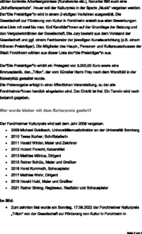 Vergeben wird der Kulturpreis an Einzelpersönlichkeiten, die entweder einen persönlichen Bezug zu Forchheim haben (z.B. Geburt, Lebensphase, Schaffensphase) oder aber auch vor Ort durch ihr künstlerisches Wirken oder auch die Installation eines Werkes vor Ort das kulturelle Leben in Forchheim bereichern. Für die Bewerbung zählen konkrete Arbeitsergebnisse (Kunstwerke etc.), hierunter fällt auch eine „Schaffensperiode“. Der*Die Preisträger*in wird in einem 2-stufigen Verfahren ausgewählt. Die Gesellschaft zur Förderung von Kultur in Forchheim erstellt aus allen Bewerbungen eine Liste mit zwei bis max. fünf Kandidat*innen auf der Grundlage der Satzung und den Vergaberichtlinien der Gesellschaft. Die Jury besteht aus dem Vorstand der Gesellschaft und ggf. einem Fachberater der jeweiligen Kunstausrichtung (z.B. einem früheren Preisträger). Die Mitglieder des Haupt-, Personal- und Kulturausschusses der Stadt Forchheim wählen aus dieser Liste den*die Preisträger*in aus. Der*Die Preisträger*in erhält ein Preisgeld von 3.000 Euro sowie eine Bronzeplastik, den „Triton“, der vom Künstler Harro Frey nach dem Wandbild in der Kaiserpfalz gestaltet wurde. Die Preisvergabe erfolgt in einer öffentlichen Veranstaltung, zu der alle Forchheimer*innen herzlich eingeladen sind. Der Eintritt ist frei. Ein Termin wird noch bekannt gegeben.