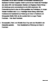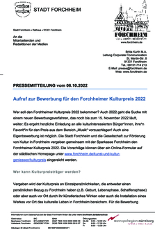 Forchheim (Stadt Forchheim). Auch 2022 geht die Suche mit einem neuen Bewerbungsverfahren, das noch bis zum 15. November 2022 läuft,weiter: Es ergeht herzliche Einladung an alle kulturinteressierten Bürger*innen, ihre*nFavorit*in für den Preis aus dem Bereich „Musik“ vorzuschlagen! Auch eineEigenbewerbung ist möglich. Die Stadt Forchheim und die Gesellschaft zur Förderungvon Kultur in Forchheim vergeben gemeinsam mit der Sparkasse Forchheim den Forchheimer Kulturpreis 2022. Die Vorschläge können über ein Online-Formular auf der städtischen Homepage unter www.forchheim.de/kunst-und-kultur-geniessen/kulturpreis eingereicht werden.