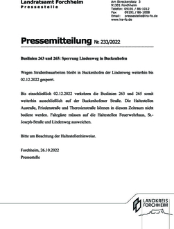 Forchheim (lra-fo). Wegen Straßenbauarbeiten bleibt in Buckenhofen der Lindenweg weiterhin bis 2. Dezember 2022 gesperrt. Daher verkehren die Buslinien 263 und 265 somitweiterhin ausschließlich auf der Buckenhofener Straße. Die HaltestellenAustraße, Friedenstraße und Theresienstraße können in diesem Zeitraum nicht bedient werden. Fahrgäste müssen auf die Haltestellen Feuerwehrhaus, St.-Joseph-Straße und Lindenweg ausweichen.Bitte um Beachtung der Haltestellenhinweise.